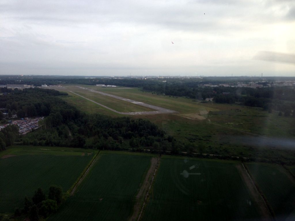 Laskeuduin sähkölinjojjen yli - jännä miten ne jännittävät enemmän kuin samankorkuinen metsä, vaikka ovat kaukanakin. Kenttä oli pehmeää mutta hiljan niitettyä nurmea, tasainen ja hieno. Pari paikallista kertoi, että poikkikiitotiekin on tulossa ja siitä tulee 1200-metrinen. Kenttä on siis nyt vielä kevytlentopaikka, AIP:ssa sitä ei vielä mainita.